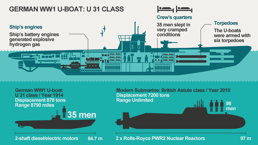 German U-boats came in a number of classes. Compare the U-31 class U-boat with the British Astute class submarine. Many U-boats sank during World War I, and occasionally one is rediscovered. Life on board was difficult, but they were devastatingly effective in battle.