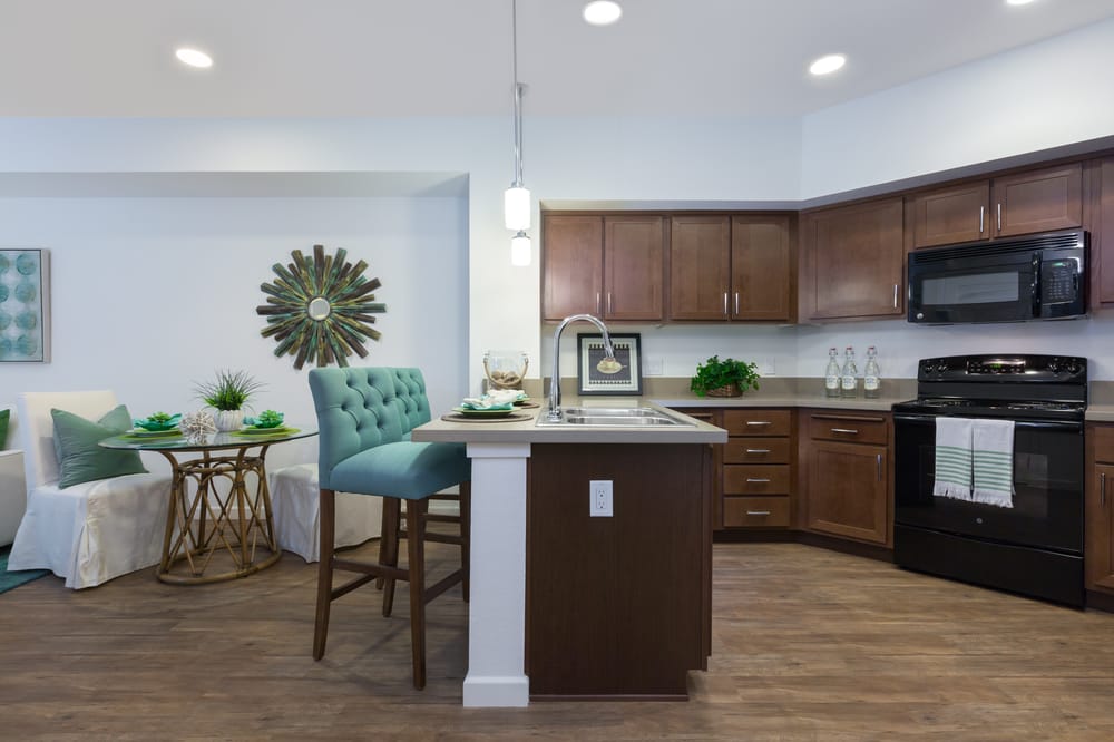 Haiwee Teton has a 1-bedroom apartment. Here is the view looking toward the balcony and toward the kitchen. The kitchen has a microwave over the stove. A dining bar separates the kitchen from the living room. The bedroom connects to the living room. The bathroom has a tub with shower.