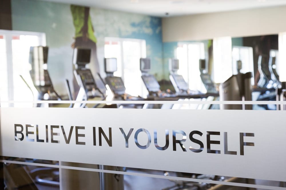The entrance to the fitness center leads to areas for weight machines, free weights, and treadmills.