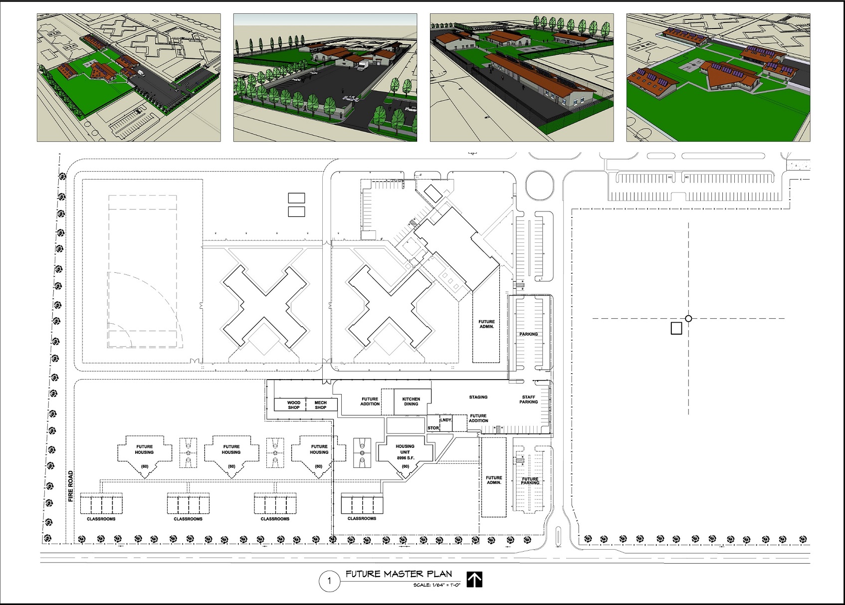 In Terramagne-Mercedes, Juvenile Hall consists of a compound just outside of town with housing, classrooms, food service, support areas, and recreation. (All of the 'future' facilities have been built.) This is the main administrative building. The two cross-shaped buildings are the male and female jails for violent or otherwise serious offenders. The four pods for less-serious offenses house boys 8-12, girls 8-12, boys 13-17, and girls 13-17. Each pod includes a day room flanked by 4 dorms, and each dorm holds 8 bunk beds, for a total of 64 beds per pod and 256 beds in the facility. Every one also has its own support area with counseling, interview-counseling, visiting-counseling, visitor toilet, medical exam room, medical office, staff toilet, staff room, and staff office space. Each pod has a basement block of three holding cells. Each holding cell includes a sink-toilet, a twin bed with storage underneath, a corner desk with stool, and a light panel.